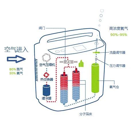 分子篩制氧機是目前市面上比較成熟的制氧方式,也是大部分家用制氧機的工作方式。分子篩制氧機通常由空氣壓縮機、變頻器、控制閥、分子篩吸附系統(tǒng)、過濾器、流量計、吸氧管或吸氧面罩組成。(如圖2)
